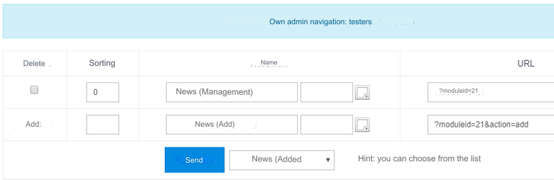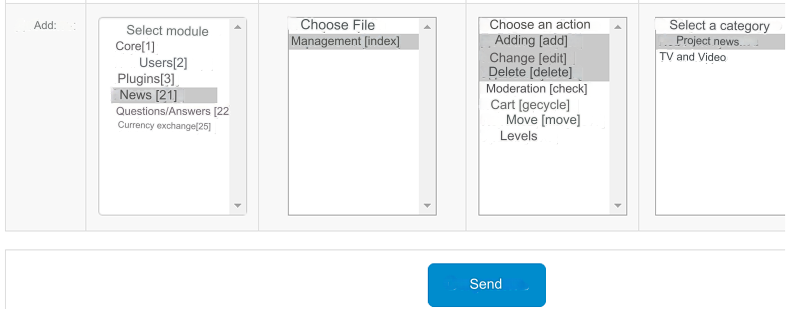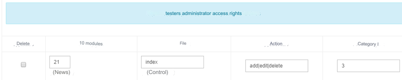 You can define access rights globally for marked modules, template management and database management. Or on the second step of adding a manager define access rights for each module or section separately. And you can limit the access rights to actions: Manage, Modify, Delete, etc. Access rights can also be limited to access to a specific category. In this way, you can very flexibly customize the manager's access rights to any of the sections. Adding permissions adds available navigation for the manager in the top block, and access rights to sections in the bottom block.