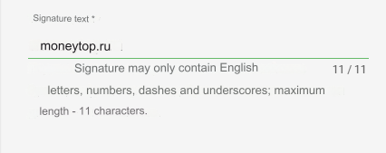 It is recommended to enter the domain of your site. In our example: moneytop.ru. The signature is used in SMS instead of the sender's number.