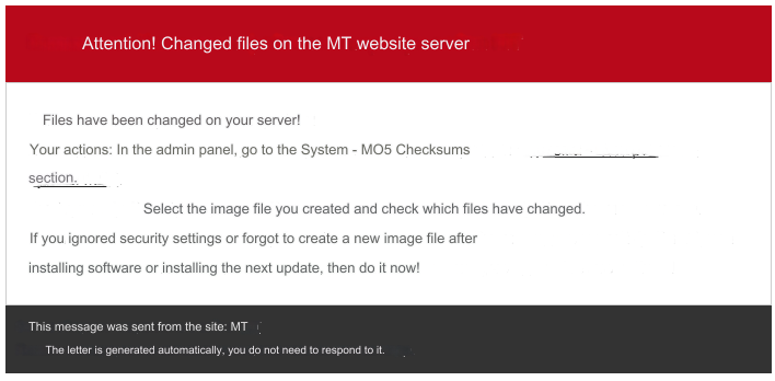 If changed or added files are found on your server, you will receive letters with the following content to the admin’s system email: