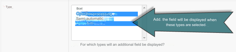 Type - when you select which types this additional option will be displayed. field. Selecting multiple types - Hold down the Ctrl key on your keyboard and select the types you want. Select All if the field should be displayed for all types.