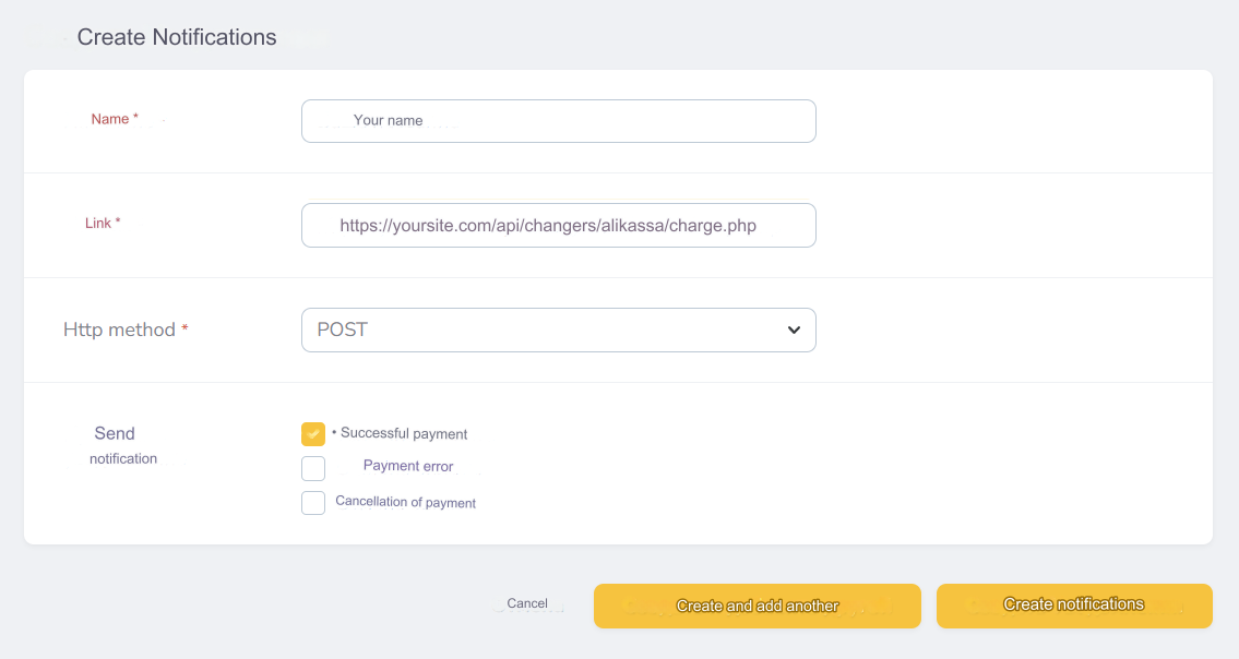 Link - enter https://yoursite.com/api/changers/alikassa/charge.php where yoursite.com is the address of your site