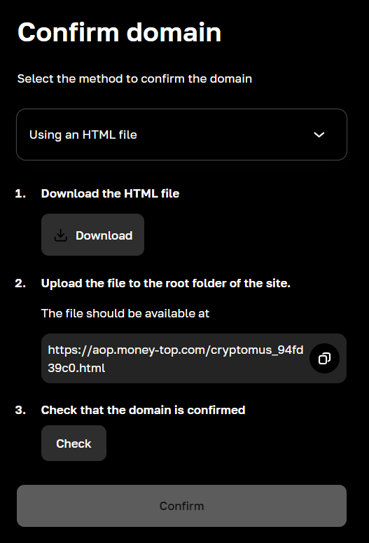Next, select a method to verify domain ownership. The simplest is to upload a file (Using an HTML file).