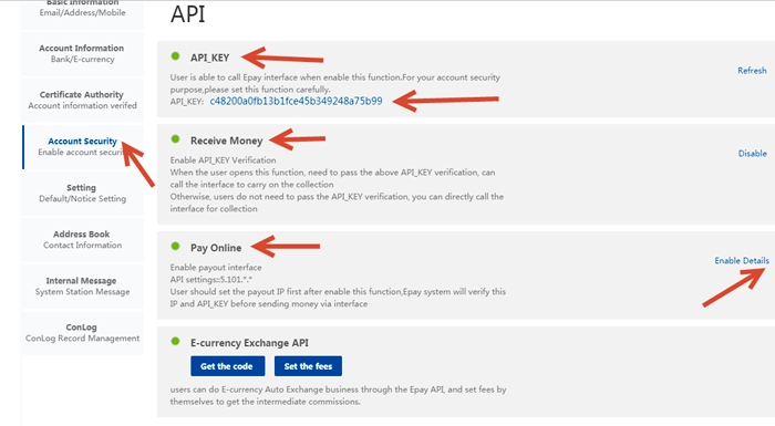 Application Program Interface (API) Enable Next Application Program Interface (API) Details API_KEY - Copy. You will need it in the admin panel. Receive Money - Enable. Pay Online - Enable and enter the server IP for outgoing requests, IP range or subnet. Look on your main admin panel: Server IP for outgoing requests. Important. If the IP is entered incorrectly, the payment API will return the error IP ERROR.
