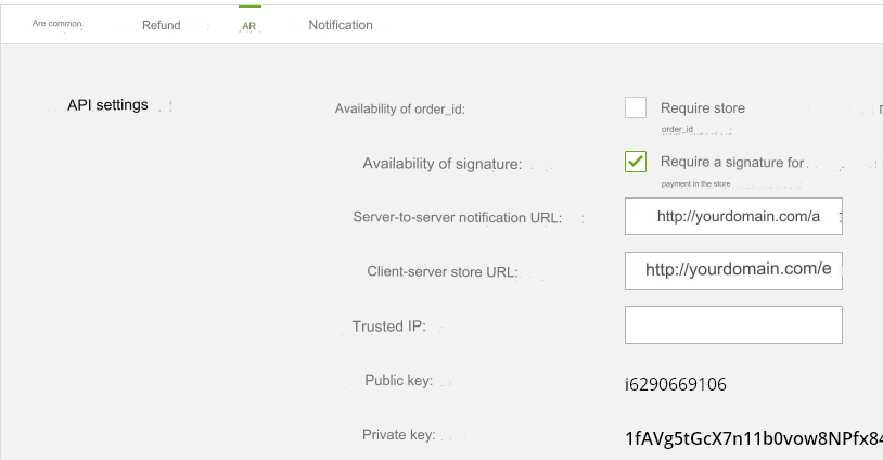 Presence of order_id - DO NOT check. Signature presence - check the box. Server-to-server notification URL - https://yourdomain.com/api/changers/liqpay/charge.php Client-server store URL - https://yourdomain.com/exchange/charge.php yourdomain.com - change to your URL Trusted IP - leave the field blank or enter the IP of your server for outgoing requests. Look on your main admin panel: Server IP for outgoing requests. Public key - will be needed in the settings in the admin panel. Private key - will be needed in the settings in the admin panel. Save settings