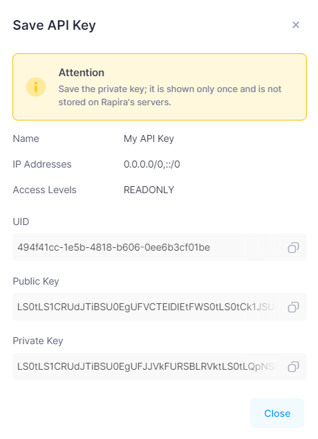 In the window that opens, save the UID and Private key, they will be needed for settings in the admin panel.