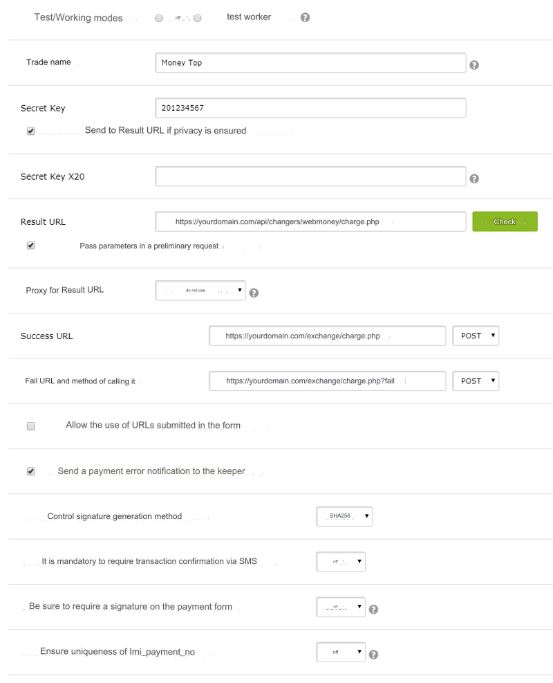 Trade name - any, usually the name of your exchange office. Will be displayed in exchange interfaces Secret Key - set the same value as in the admin panel Currency exchange-Payment systems-WebMoney WMZ-Secret Key For example: fdgkfhg758695 - random set of Latin characters and numbers Send Secret Key to Result URL, if Result URL ensures secrecy - MUST be ticked! Result URL - https://yourdomain.com/api/changers/webmoney/charge.php (yourdomain.com - replace with your domain) Check Result URL. Click the Check button opposite. The response should be: Result URL available. Returns code 200(SUCCESS) and text: fail Pass parameters in a preliminary request - the checkbox is REQUIRED! Success URL - https://yourdomain.com/exchange/charge.php (yourdomain.com - replace with your domain) Success URL call method - Select the POST field. Fail URL - https://yourdomain.com/exchange/charge.php?fail (yourdomain.com - replace with your domain) Fail URL call method - Select the POST field. Control signature generation method - SHA256 Test/Working modes - Working Do not touch the remaining buttons and windows. You leave everything as it was. Click the save button. Carry out exactly the same settings with the rest of the wallets. EXTREMELY IMPORTANT!!! Secret Key FOR EACH OF THE WALLETS MUST HAVE ITS OWN - INDIVIDUAL. Be sure to enter all URLs with https if you have the SSL protocol enabled and configured.