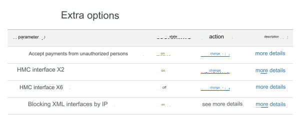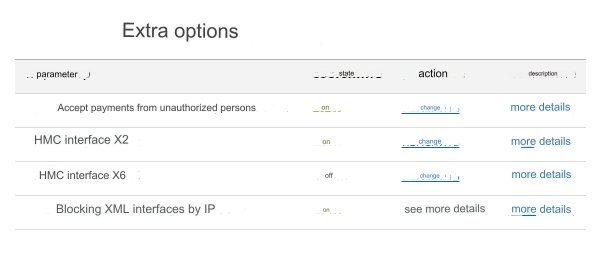 Accept payments from unauthorized persons - enable XML interface X2 - enable Blocking XML interfaces by IP - enable (go to settings - more details)