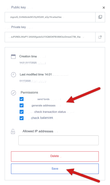 Public key - enter the Public key of your API from WestWallet settings Private key - enter the Private key of your API from the WestWallet settings Network - a network for multi-network currencies. Possible values: ERC, ERC20, TRC, TRC20, BEP, BEP20. Leave blank if network selection is not needed Save the settings.