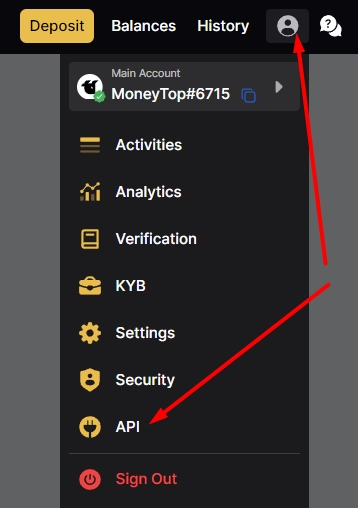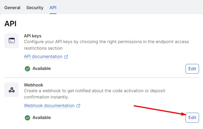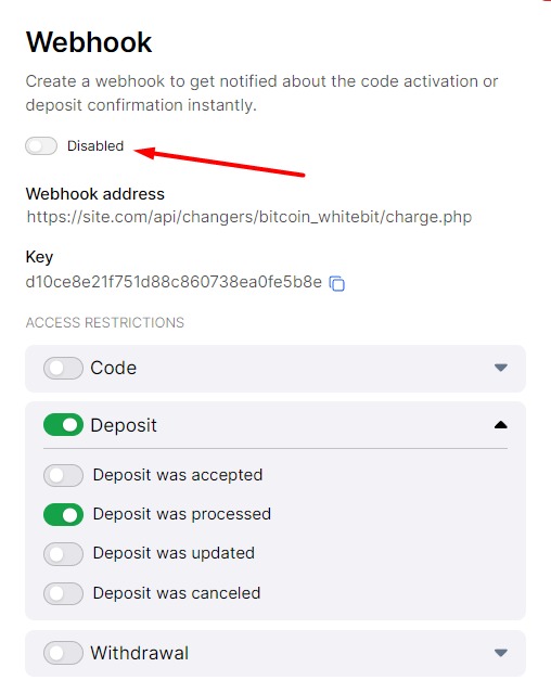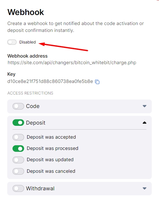 Provider - specify VISAMASTER to work with cards. ADVCASH for working with AdvCash. (only for whitebit API) Network - a network for multi-network currencies. Possible values: ERC20, TRC20, OMNI, BEP20, EOS. Leave blank if network selection is not needed (only for bitcoin_whitebit API) API Key - enter your API Key from the WhiteBit settings API Secret Key - enter the Secret Key of your API from the WhiteBit settings Webhook Secret Key - enter the Secret Key of your Webhook from the WhiteBit settings Save the settings.