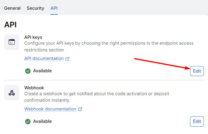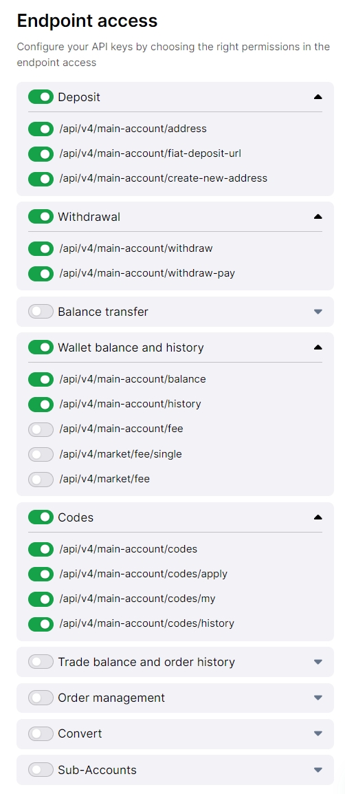 Click the Generate API Key button, copy the generated Key and Secret Key, they will be needed for configuration in the admin panel. Enter any name and select Endpoint access as in the screenshot: