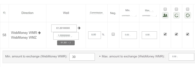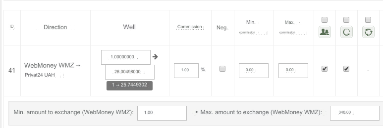 Example: Direction - WebMoney WMZ => WebMoney WMR Rate - 34.3681 Commission - 0.5% (0.1718405) (math: 34.3681 * 0.5 / 100) Final rate - 34.3681 - 0.1718405 = 34.1962595 (rounded to 34.19626) Check the Reg. (Negative?) Final rate - 34.3681 + 0.1718405 = 34.5399405 (rounded to 34.53994) The payment system commission is not taken into account in this miscalculation.