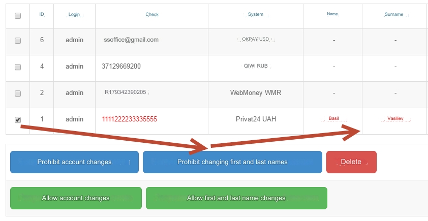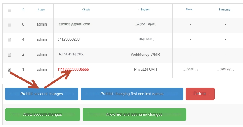 Go to the Currency exchange - User accounts section, check the box next to the account that you want to prohibit changing and click the Prohibit changing account button.