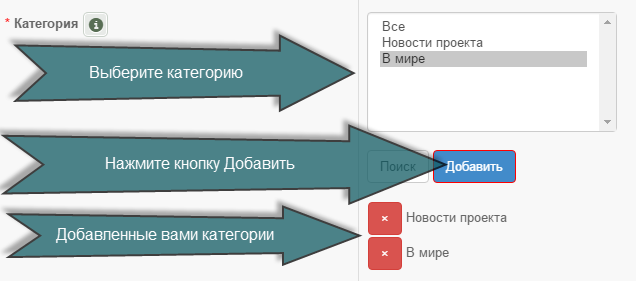 Категория - при выборе каких категорий будет выведено это доп. поле. Для выбора нескольких категорий воспользуйтесь кнопкой Добавить. Выберите Все, если поле должно быть выведено для всех категорий.