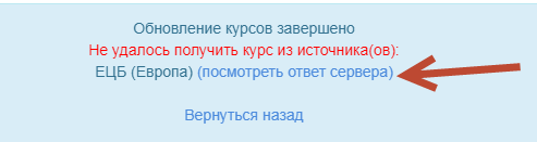 В нашем примере ошибка получения курсов с сайта источника ЕЦБ (Европа)
