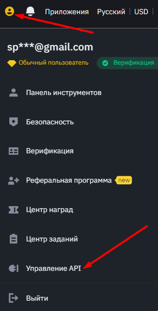 После верификации нажмите на иконку в форме человека и перейдите на страницу Управление API