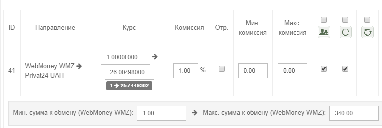 Пример: Направление - WebMoney WMZ => WebMoney WMR Курс - 34.3681 Комиссия - 0.5 % (0.1718405) (математика: 34.3681 * 0.5 / 100) Итоговый курс - 34.3681 - 0.1718405 = 34.1962595 (округление 34.19626) Выставляем галочку Отр. (Отрицательная?) Итоговый курс - 34.3681 + 0.1718405 = 34.5399405 (округление 34.53994) Комиссия платежной системы в этом просчете не учтена.