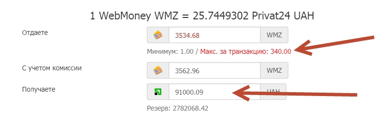 Макс. сумма к обмену: 340 WMZ, т.е. эквивалент по курсу Privat24 UAH ~ 8750