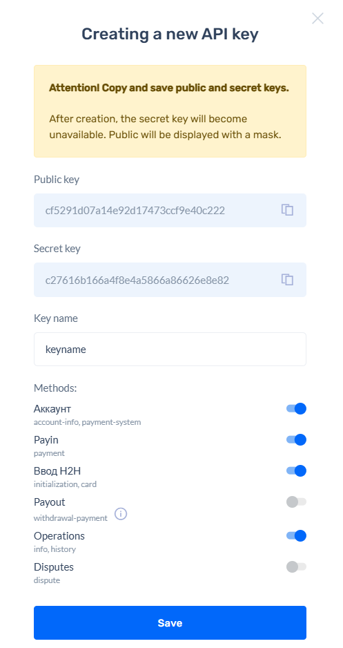 Public Key - введите Public Key созданный в аккаунте платежной системы