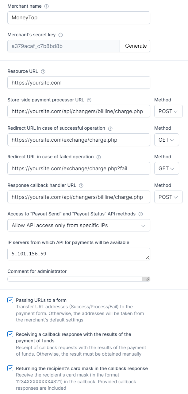 Response callback handler URL - введите https://yoursite.com/api/changers/billline/charge.php (где yoursite.com - адрес вашего сайта) и выберите метод POST