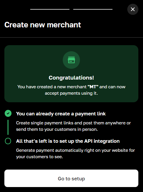 После создания мерчанта перейдите в его настройки нажав на кнопку Go to Setup.