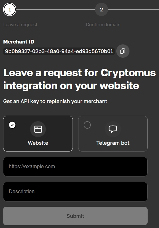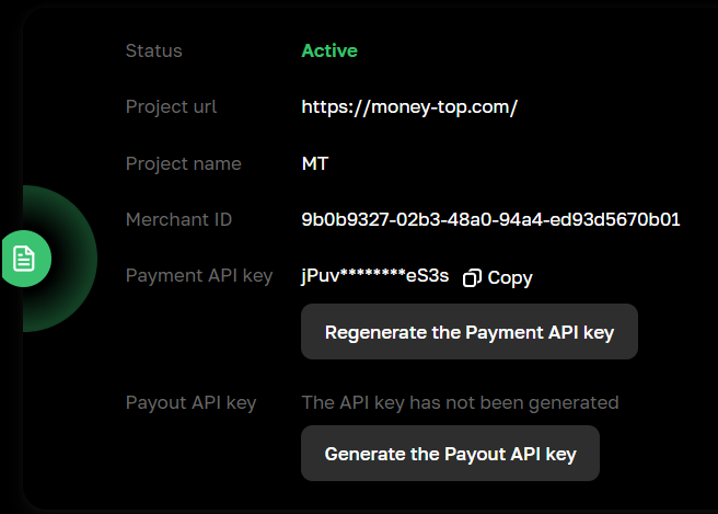 Скопируйте Merchant ID и Payment API key для настроек в админке.