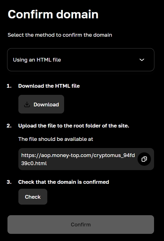 Далее выберите метод подтверждения владения доменом. Самый простой - загрузка файла (Using an HTML file).