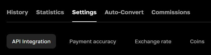 Вкладка Settings - Coin: список валют, которые будут доступны для оплаты счета и процент скидки/комиссии для каждой из них.