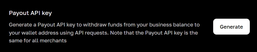 Нажмите на кнопку Generate the Payout API key, на следующей странице нажмите кнопку Generate.