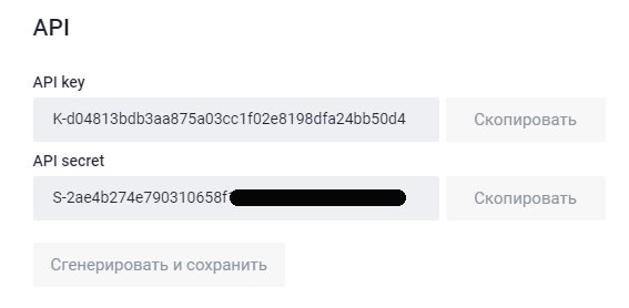 Скопируйте и сохраните API key и API secret (понадобятся в админке).