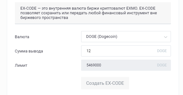Биржа поддерживает генерацию EXMO Code и для криптовалют.