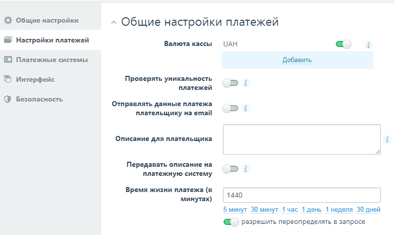 Валюта кассы - уже выбрана на первом шаге. Проверять уникальность платежей - НЕ надо включать. Отправлять данные платежа плательщику на email - по желанию. Описание для плательщика - по желанию. Передавать описание на платежную систему - по желанию. Время жизни платежа (в минутах) - 1 день. разрешить переопределять в запросе - включите.