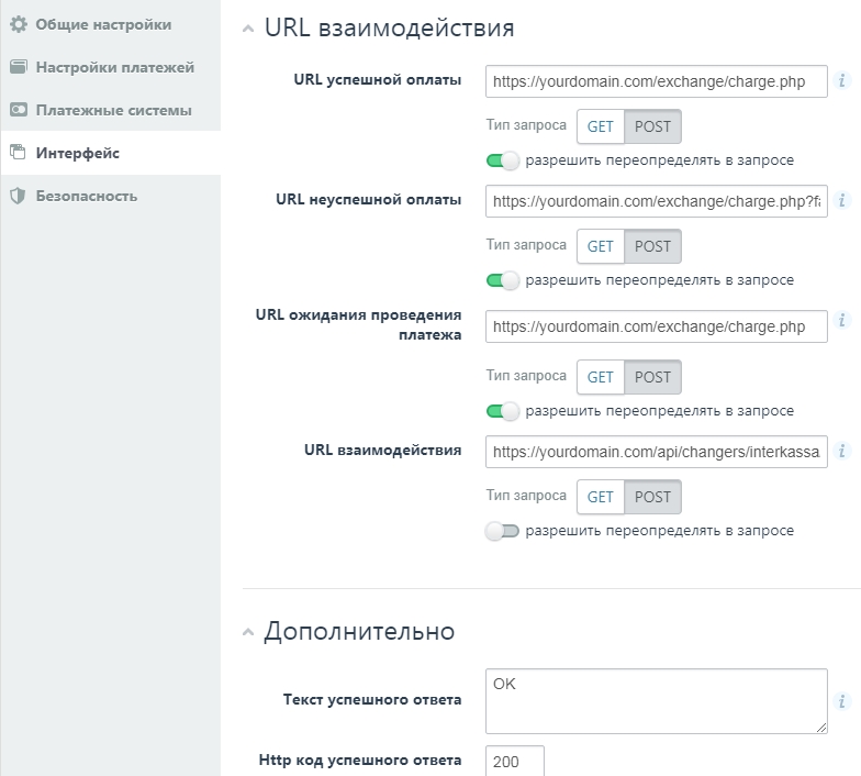 Тип запроса - POST для всех URL успешной оплаты - https://yourdomain.com/exchange/charge.php разрешить переопределять в запросе - Включить URL неуспешной оплаты - https://yourdomain.com/exchange/charge.php?fail разрешить переопределять в запросе - Включить URL ожидания проведения платежа - https://yourdomain.com/exchange/charge.php разрешить переопределять в запросе - Включить URL взаимодействия - https://yourdomain.com/api/changers/interkassa/charge.php разрешить переопределять в запросе - НЕ НАДО включать ДОПОЛНИТЕЛЬНО Текст успешного ответа - OK Http код успешного ответа - 200 yourdomain.com - замените на URL вашего сайта и сохраните настройки.