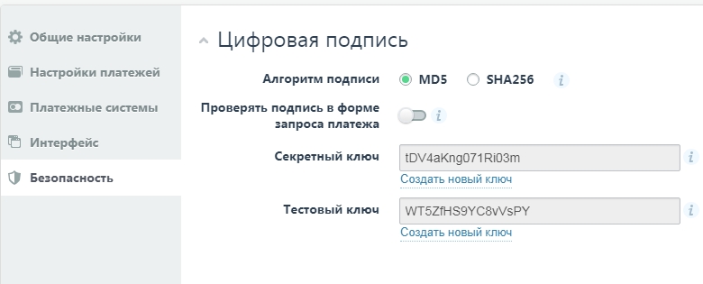 Алгоритм подписи - MD5 Проверять подпись в форме запроса платежа - НЕ НАДО включать Секретный ключ - набор символов. Должен совпадать с введенным в админке (Секретный ключ) Тестовый ключ - используется для тестов. Сморите подсказки ниже: Тестовые платежи Сохраните настройки. Нюанс с секретным ключом. Будьте внимательны. Интеркасса может сгенерировать ключ содержащий символы, которые наша система в целях безопасности преобразует в мнемоники. В этом случае следует сгенерировать новый ключ, не содержащий подобные символы. Пример: Интеркасса сгенерировала секретный ключ: iBnUd7uAetYt0x7z В этом ключе есть символы 0x (префикс для числовых констант). В целях безопасности x будет преобразована в мнемоник: #120; Подпись в этом случае не совпадет.