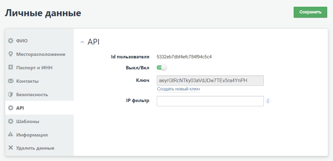 Id пользователя - сохраните для настройки в админке Выкл/Вкл - переключите в положение Включено Ключ - сгенерируйте ключ API и сохраните для настройки в админке IP фильтр - опционально, введите IP вашего сервера