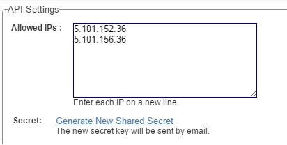 API Settings - ввести IP вашего сервера для исходящих запросов. Смотрите на главной вашей админки: IP сервера для исходящих запросов.