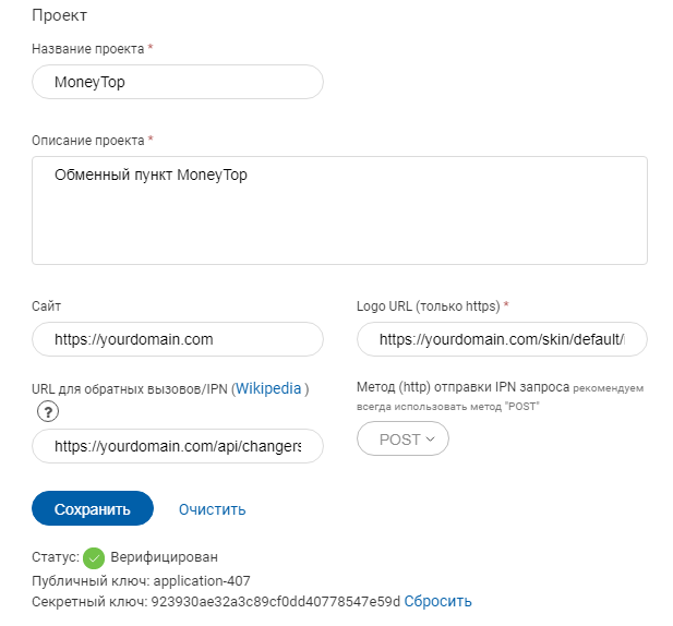Название проекта - по желанию. Например название вашего обменника. Описание проекта - по желанию. Например Обменный пункт такой то Сайт - введите домен вашего сайта Logo URL (только https) - https://yourdomain.com/skin/default/images/logo.png URL для обратных вызовов/IPN - https://yourdomain.com/api/changers/payop/charge.php Метод (http) отправки IPN запроса - POST