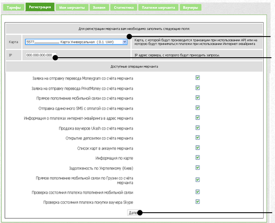 Доступные операции мерчанта - обязательно отметить галочкой: