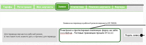 Для перевода мерчанта в рабочий режим перейдите на вкладку Заявки.