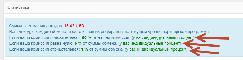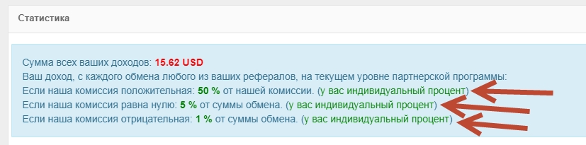 У панелі керування користувача в розділі Партнерська програма буде виведено повідомлення про використання індивідуального відсотка.