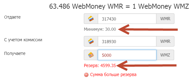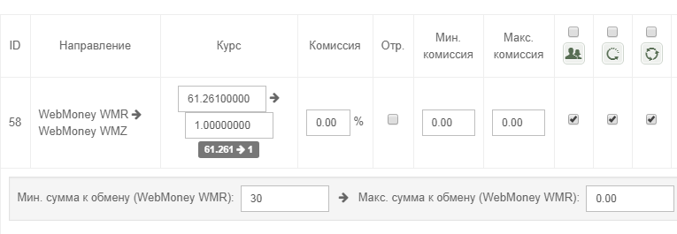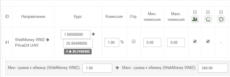 Приклад: Напрямок - WebMoney WMZ => WebMoney WMR Курс - 34.3681 Комісія - 0.5 % (0.1718405) (математика: 34.3681 * 0.5 / 100) Підсумковий курс - 34.3681 - 0.1718405 = 34.1962595 (округлення 34.19626) Виставляємо галочку Відр. (Негативна?) Підсумковий курс - 34.3681 + 0.1718405 = 34.5399405 (округлення 34.53994) Комісія платіжної системи у цьому прорахунку не враховано.