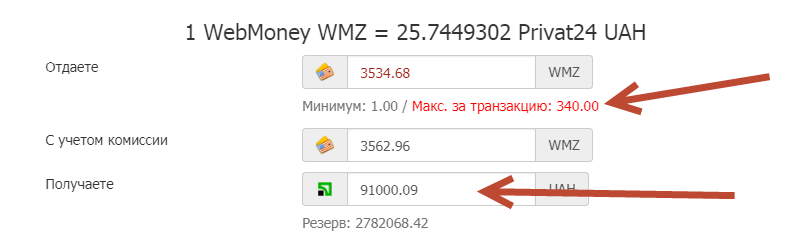 Макс. сума до обміну: 340 WMZ, тобто. еквівалент за курсом Privat24 UAH ~ 8750