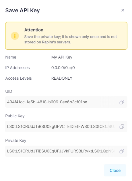 UID - ідентифікатор API зі сторінки ключів облікового запису Rapira Private Key - приватний ключ API, отриманий під час створення ключів Network - мережа для мультимережевих валют. Можливі значення: Bitcoin, BNB, TRC20, Toncoin, BEP20, ERC20. Залишіть порожнім, якщо вибір мережі не потрібен. Збережіть налаштування.