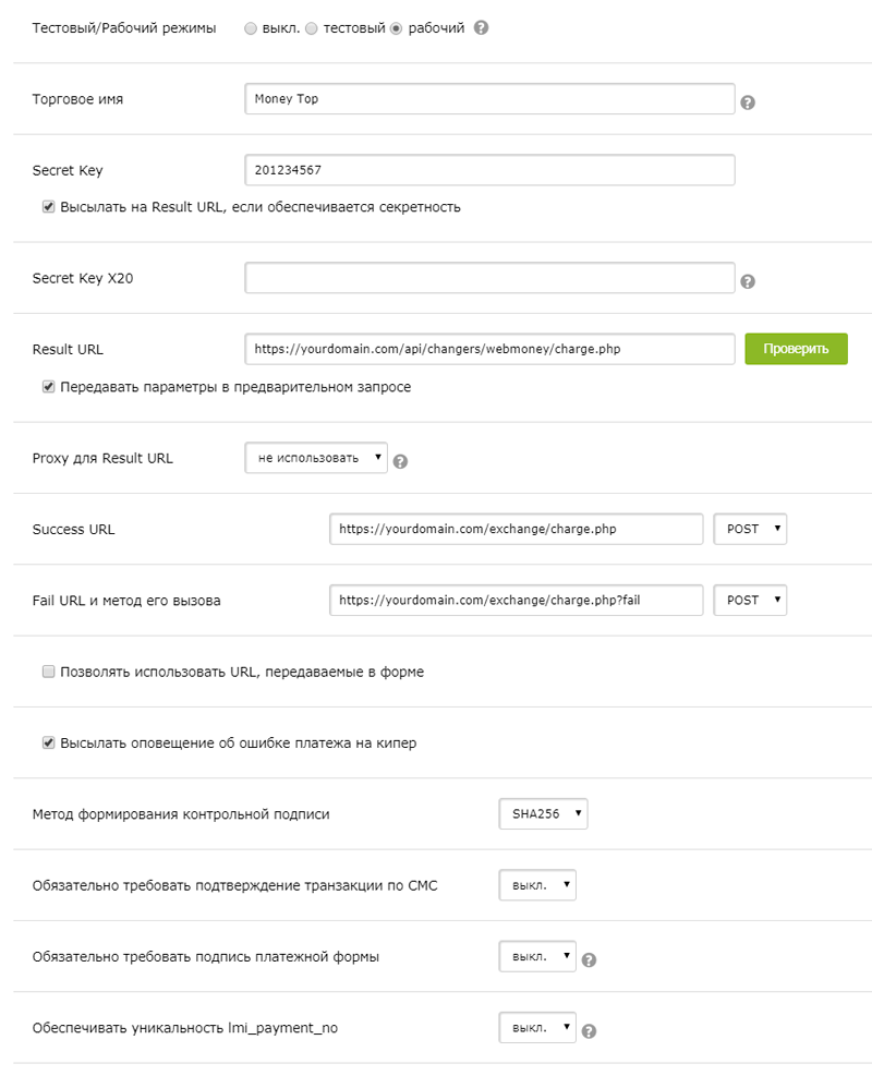 Торгове ім'я - будь-яка, звичайно назва вашого обмінного пункту. Відображатиметься в інтерфейсах обміну Secret Key - виставляйте таке ж значення, що і в адмінці Обмін валют-Платежні системи-WebMoney WMZ-Secret Key Наприклад: fdgkfhg758695 - випадковий набір латинських символів та цифр Висилати Secret Key на Result URL, якщо Result URL забезпечує секретність - галочку СТАВИТИ ОБОВ'ЯЗКОВО! Result URL - https://yourdomain.com/api/changers/webmoney/charge.php (yourdomain.com - замінити на свій домен) Перевірте Result URL. Клацніть напроти кнопку Перевірити. Відповідь має бути: Result URL доступний. Повертає код 200(SUCCESS) та текст: fail Передавати параметри в попередньому запиті - галочку СТАВИТИ ОБОВ'ЯЗКОВО! Success URL - https://yourdomain.com/exchange/charge.php (yourdomain.com - замінити на свій домен) Метод виклику Success URL - Вибрати поле POST. Fail URL - https://yourdomain.com/exchange/charge.php?fail (yourdomain.com - замінити на свій домен) Метод виклику Fail URL - Вибрати поле POST. Метод формування контрольного підпису - SHA256 Тестовий/Робочий режими - Робочий Інші кнопки та вікна не чіпаєте. Залишаєте все, як було. Клацніть кнопку зберегти. Точно такі ж налаштування провести і з рештою гаманців. Вкрай ВАЖЛИВО! Secret Key ДЛЯ КОЖНОГО З ГАМАНЕКІВ ПОВИНЕН БУТИ СВІЙ - ІНДИВІДУАЛЬНИЙ. Всі URL обов'язково вводите з https, якщо у вас включений і налаштований протокол SSL.