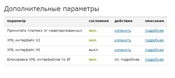 Приймати платежі від неавторизованих - увімкнути XML інтерфейс X2 - увімкнути Блокування XML інтерфейсів по IP - увімкнути (перейти до налаштувань - докладніше)