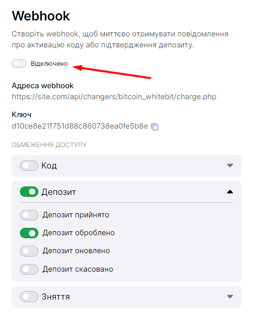 Provider - вкажіть VISAMASTER для роботи з картами. ADVCASH для роботи з AdvCash. (тільки для API whitebit) Network - мережа для мультимережевих валют. Можливі значення: ERC20, TRC20, OMNI, BEP20, EOS. Залишіть порожнім, якщо вибір мережі не потрібен (тільки для API bitcoin_whitebit) API Key - введіть Ключ вашого API з налаштувань WhiteBit API Secret Key - введіть секретний ключ вашого API з налаштувань WhiteBit Webhook Secret Key - введіть Секретний ключ вашого Webhook із налаштувань WhiteBit Збережіть налаштування.