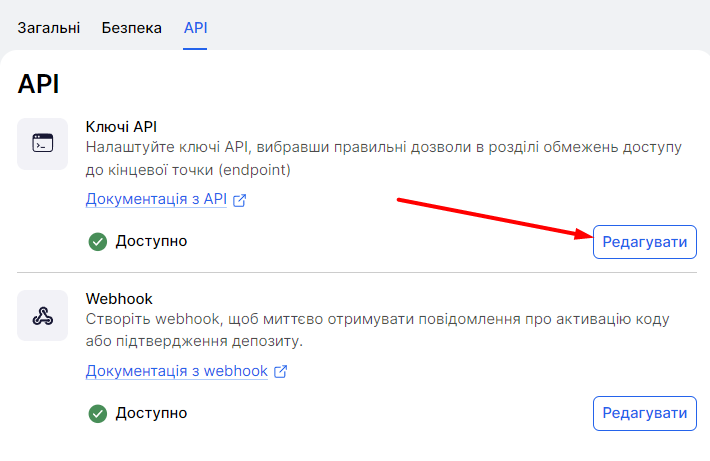 На сторінці API натисніть кнопку редагування ключів