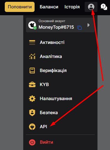 Увійдіть до облікового запису, натисніть на іконку у формі людини та перейдіть на сторінку API