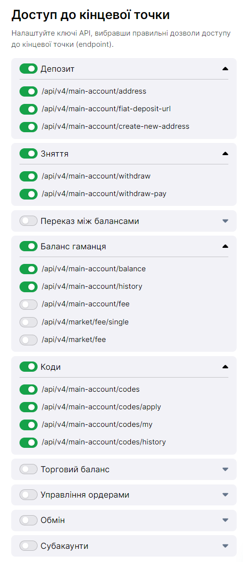 Whitebit підтримує операції з криптовалютами, купонами (кодами), банківськими картками та AdvCash. У вас є 4 види API для роботи з різними операціями. Докладніше дивіться у списку підтримуваних валют.