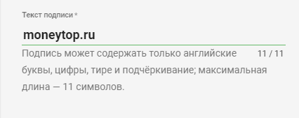 Рекомендується вводити домен вашого сайту. У нашому прикладі: moneytop.ru. Підпис використовується у SMS замість номера відправника.