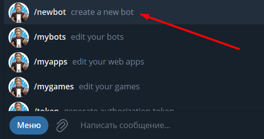 Натисніть Старт і в меню (або у вітальному повідомленні бота) виберіть першу команду /newbot